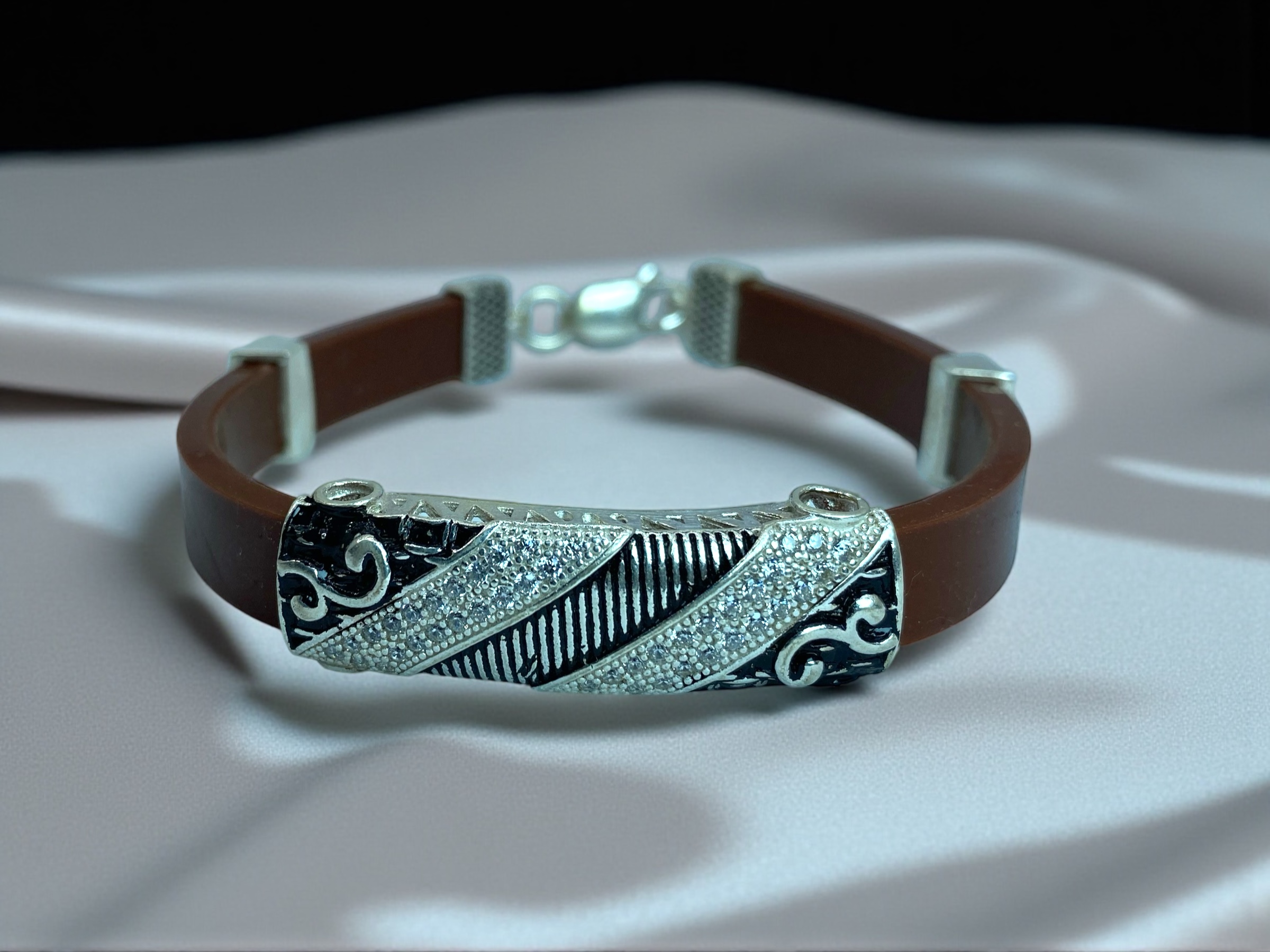 Upgrade your style statement with this Men’s Silver-Plated Bracelet featuring a durable brown strap and a stunning designer centerpiece. The detailed silver artwork, enhanced with sparkling stones, reflects fine craftsmanship and modern appeal.